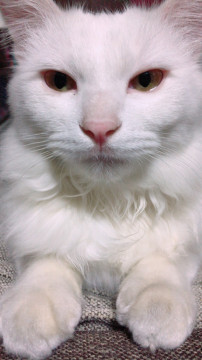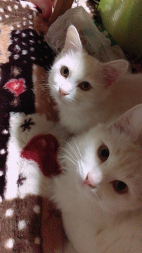 2匹とも真っ白の猫で、すごく人懐っこくて、猫が苦手です。雑種ですが、大型の長毛種が混じっているので、普通の8ヶ月の子よりデカいです。