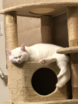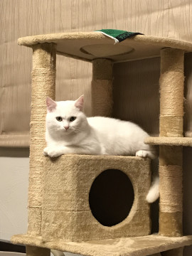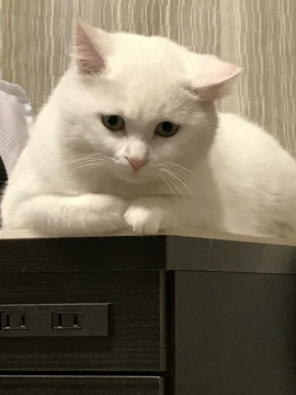 全身真っ白です。力が強く、たくさん食べます。去勢済みで4キロ程あります。耳のフチが少し赤くなってます。8ヶ月程、外で餌付けされて、家で飼い始めて2ヶ月です。