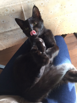 名前はネロですが、呼んでも反応しないかもしれません。元来人懐こく、初対面の人にでも触られると喉をゴロゴロ言わせ、抱っこ膝乗り大好き、お腹や肉球や尻尾を触っても全然嫌がりません。おしゃべりが好きでよく鳴きますが、最近少し人見知りがはじまっているようにも思います。
