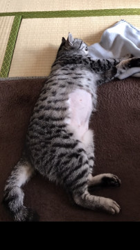 全体がシルバーで左耳カットされていて鍵シッポです。体も小さめで声も小さく赤ちゃん猫のような鳴き方をします。怖がりなので近づくと逃げると思います。不妊手術して一カ月程しか経ってないのでお腹の毛がまだ生えてきていません。首輪無しです。