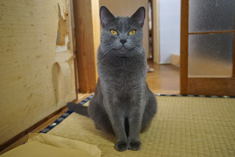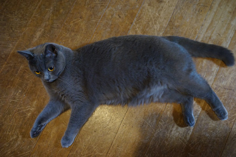 全身グレーの短毛、尻尾にうっすらシマ模様があります。