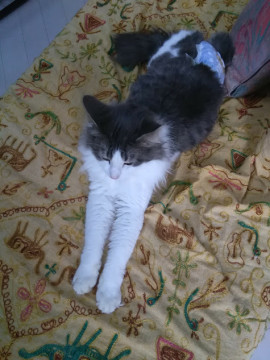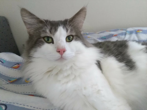 手足は白く、頭にグレーが入ってます。ふさふさの尻尾が特徴的です。『おとー』名前を呼ぶと返事をすることがあります。