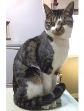 焦げ茶のシマ模様で胸と手先が白く、顔にも体と同じ色の模様があります。