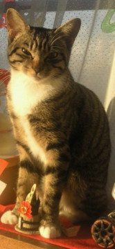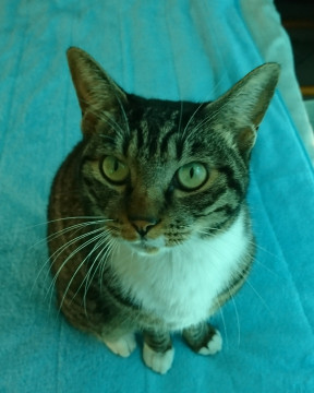 キジトラで前足は短い白ソックス、後ろ足は長い白ソックスで、胸は白いです。