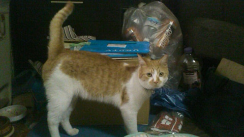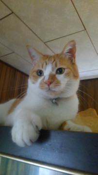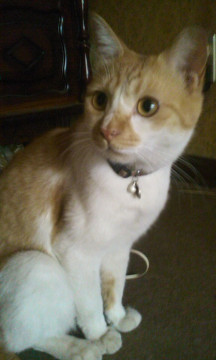 背中が茶トラでお腹が白です。鼻のまわりが茶色です。鼻の半分が茶と白のツートーンに別れてます。去勢済みで首輪は付けてません。
