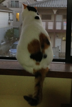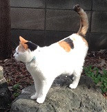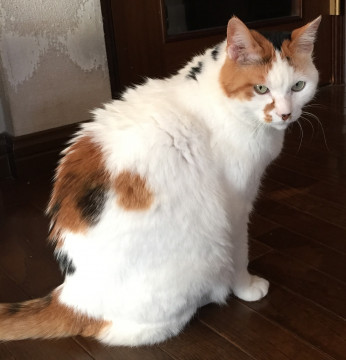 体長は大きいほうです。頭と腰としっぽに黒・茶の毛があり、体のほとんどが白の三毛猫です。 鼻の右横に茶色模様あり。 しっぽは長く、立っているときは常に上に上がっていて背中の方にややカーブしています。歯が全部ありません。 首輪はオレンジ色で、留め具は黄色。(外れている可能性ありです。)