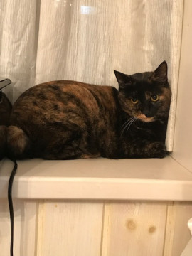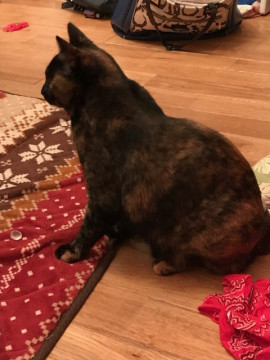 全身黒と茶のサビ柄で、下の顎だけくっきり茶色。