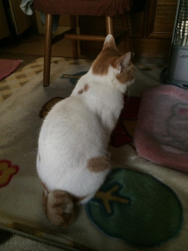 白が多い、薄茶色のブチです。尻尾が4回曲がっており、ボブテールに見えます。