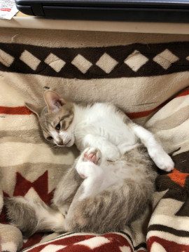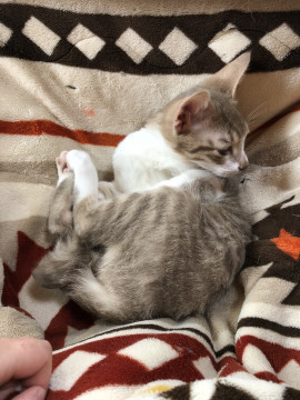 薄い色のキジネコで、しっぽがかなり曲がっています。