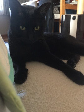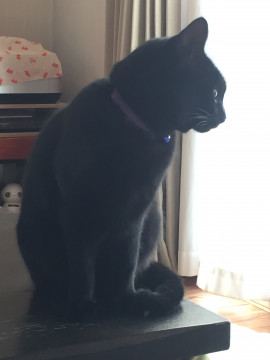 しっぽの長い黒猫です。紫の鈴付きの首輪をしています。元々捨て猫でしたので、慣れていない人には警戒します。