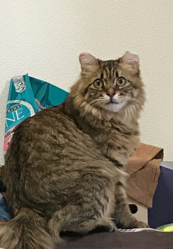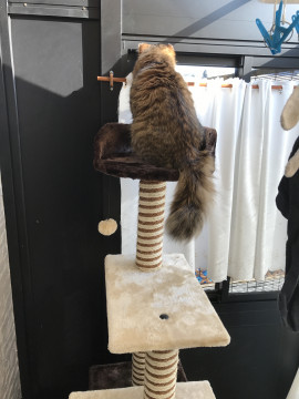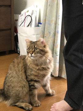 全体的にフサフサとしていて、茶色のトラ柄です。