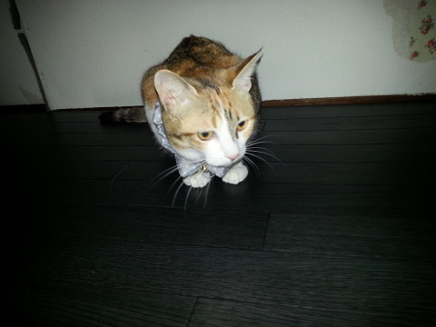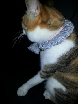 手足が長くしっぽもまっすぐで長いみけ猫のめすです。ピンクの首輪でBとゆうシルバ-のイニシャルがついています。グレ-のリボンの首輪と2つしています。2才です。病気もちの為、毎日の服用が必要な為、心配です。家の中でずっと飼っていたので外に出た事がありません。去年姉妹2匹でもらってきたので常に2匹一緒じゃないとすごく大きな声で泣きます。
