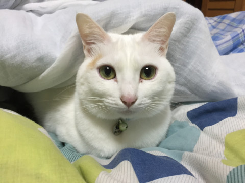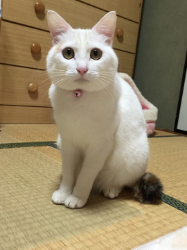 ■真正面から見るとほとんど白ネコで、左目上に薄い茶色の模様があります。