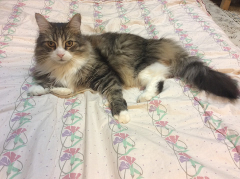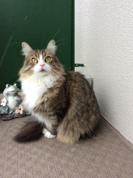 ノルウェージャンフォレストキャット。こげ茶に,胸と腹が白いハチワレ。尻尾が黒っぽくフサフサ。手足が白いソックス。左足の裏側がこげ茶。