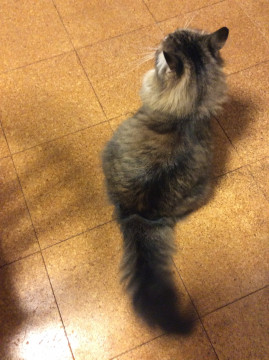 男性が苦手。気が強く,力も強いけれど,繊細なところのある猫です。あまり鳴きませんが,鳴くときは「グルニャン↑」「アー」「ハー」といった声を出します。器から水を飲むときに,手で床を掻く癖があります。