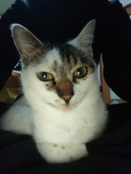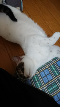 頭の上と胴体の一部分としっぽがキジトラ模様です。