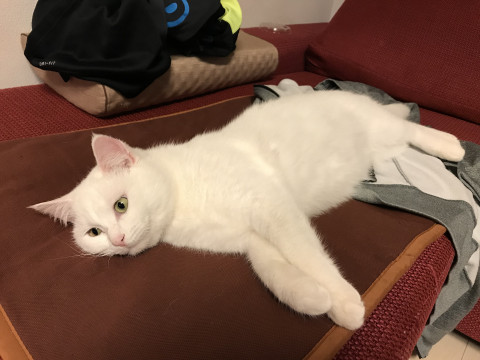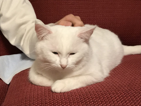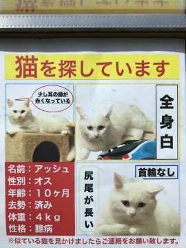 全身白です。去勢済み。首輪無しでシッポは長いです。人慣れしていますが、男性だと逃げたりします。