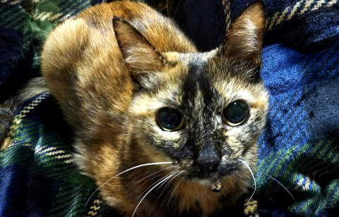 茶色と黒が混ざるサビ猫♀おデコから鼻までは黒色が目立ちます。写真は黒眼がちですが、今現在、両眼とも白内障のため眼球はかなり白く濁っています。鈴付きの赤とオレンジの布製首輪をしています。立ち耳、尻尾は長く真っすぐ、細身の体型です。