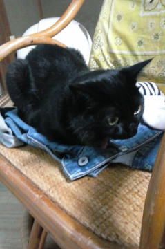 しっぽがボンボンみたいに丸いです。首輪はけば立った赤色鈴と認識番号のついたコインが付います。ビビりで人なれしてないのですぐ逃げます。黒猫雌避妊手術してます。雌ですが体格はいいです。