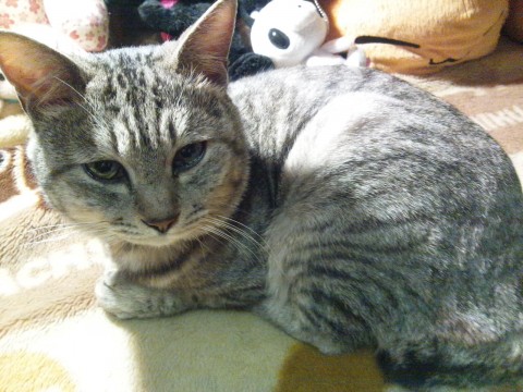 トラ柄で色は灰色、左前足が不自由、短い鍵尻尾、青い首輪がついてます。
