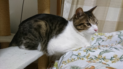 キジ白、足とお腹が白色、しっぽまっすぐで長い