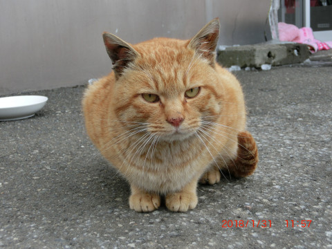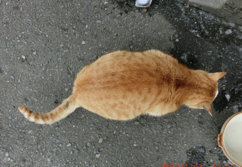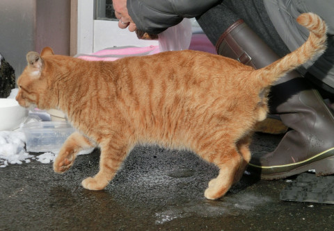 去勢していない茶トラのシマ模様で、長い尻尾の上の一部が黒くなっています。