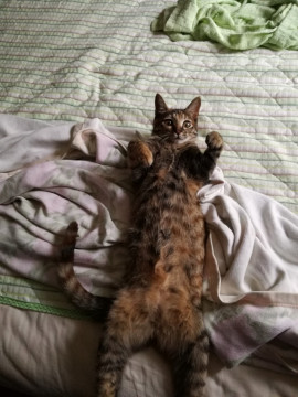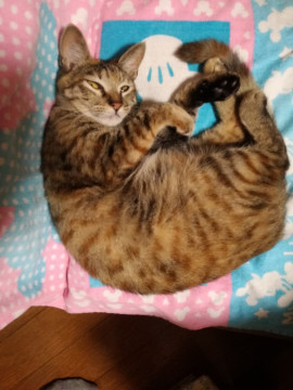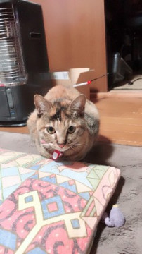 ピンクの首輪に鈴と猫の顔の名札が付いていますが、名札の文字は消えてしまっています。