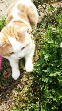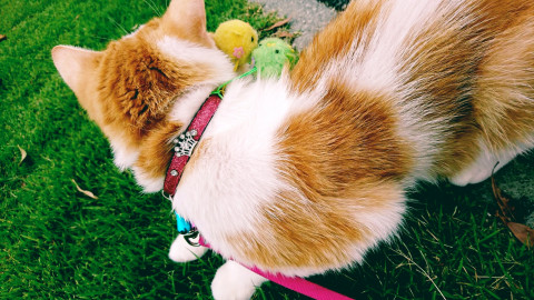 茶トラ白です。男の子で大きめ?長めの尻尾 ピンク系ラメ入りで 王冠の飾りと緑色のひよこのポンポンがついた首輪をしています。