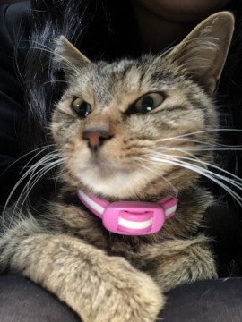 ノミ取り用のピンクと白の首輪と赤いバンダナを付けている。