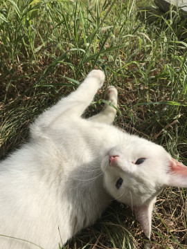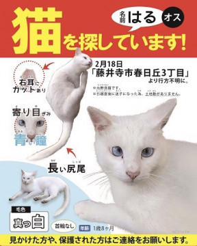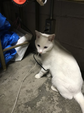 なにも模様のないない真っ白な猫です。両目とも青色です。慣れていない人にはあまり鳴きません。でも餌は手から食べます。土地勘が全然ないので、あてもなく彷徨っていると思います。