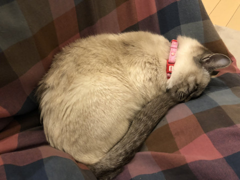 シャム猫の雑種です。白とグレー。顔やしっぽはトラ模様です。不明時ピンクの首輪をしています。メス、とても怖がりで、警戒心が強いです。
