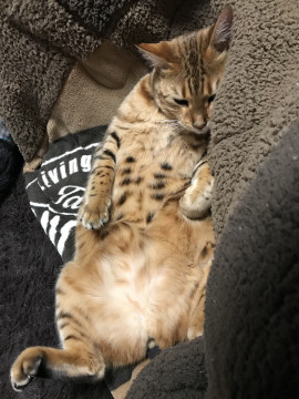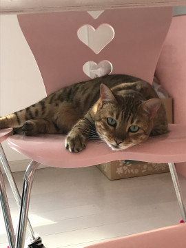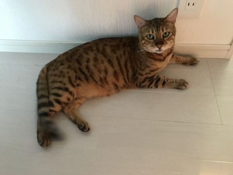 茶のベンガル猫のメスです。黒の首輪にキラキラの文字でRU?NAと付けてあります。