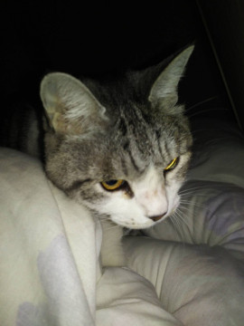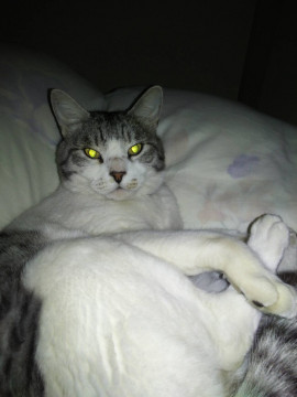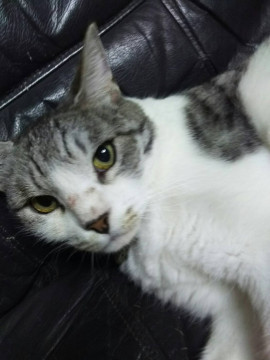 背中、頭、尻尾がトラ模様、それ以外は白い模様です。