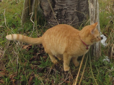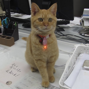 赤い首輪をしたトラ猫の女の子です。尻尾は先端まで真っ直ぐです。初めての人には警戒しますが、直ぐに慣れます。初めての所では、狭い所に隠れて、なかなか出てきません。食欲は旺盛です。
