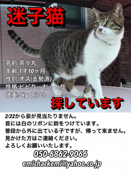 保健所、動物愛護センター、動物管理保護センター、警察、付近の動物病院には問い合わせ済みです。