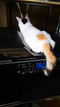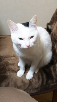 白ベース。頭に黒、尻尾の付け根に茶色の模様があり、尻尾が三毛になっています。
