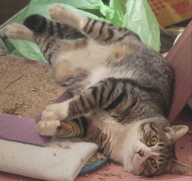 金目・鯖白・ハチワレ・白ソックス・尾長・背中に背骨に沿って毛がダマになっているのが特徴・6kgくらいのややぽっちゃり