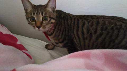 ピンクの鈴付き首輪と、短く丸いしっぽが特徴です。