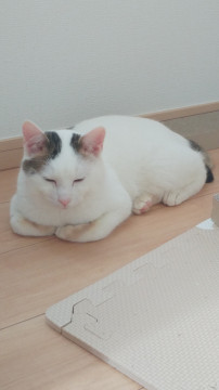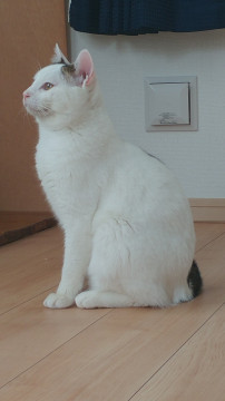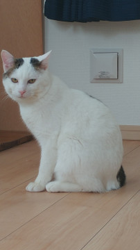 半分から折れたしっぽ。猫が好きみたいで見るだけでゴロゴロ言います。人間が触ろうとするとビビりますが、すぐゴロゴロ言います。何歳か不明だが、歯が綺麗です。かわいい小さな鳴き声です。去勢済みでした。