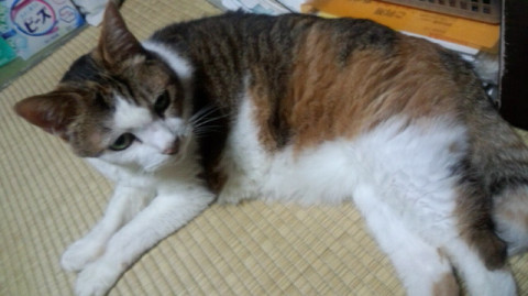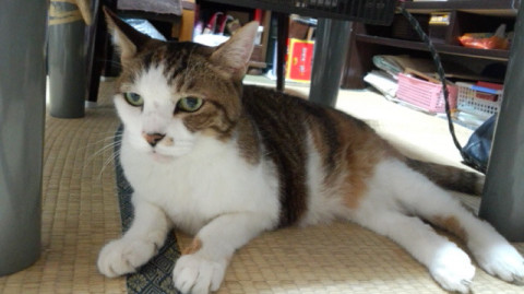 メス、18歳、体重:3.6kg、縞三毛っぽいキジトラ白