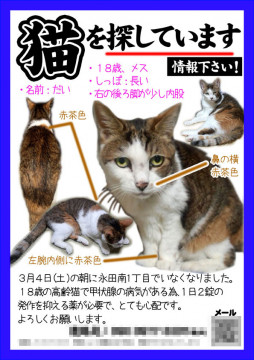 貼り紙・チラシを見た方から保護しているとの連絡があり無事に見つけ出すことができました。失踪当日、数十キロ離れた地区の路上で倒れていた所親切な方が拾って下さったようです。