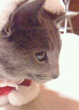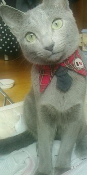 ロシアンブルー・グレー色・やせ形・長くて細いしっぽ・耳はピンとたち、口元はロシアンスマイルが特徴です。完全室内飼いなのと性格上、とても臆病な子です。はずれてなければ、写真の赤いチェック襟の首輪をしています。そこにピンクの猫型の鈴も付けています。