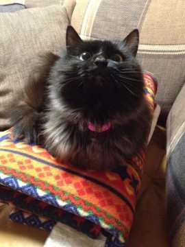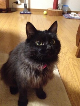 黒猫のメスで、ピンクのノミとり首輪をしています。避妊済み。ちょっと毛が長めで、目が大きいです。