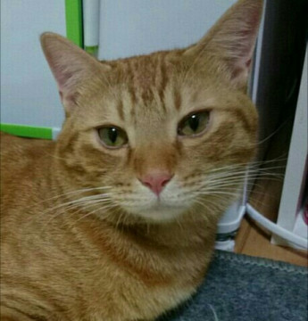 茶トラ柄で口元からあごにかけて白い毛が生えています。