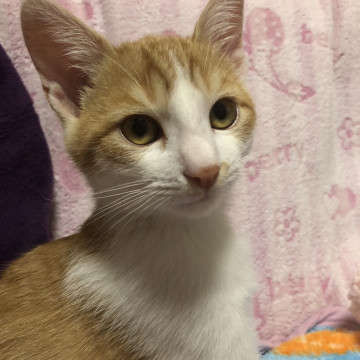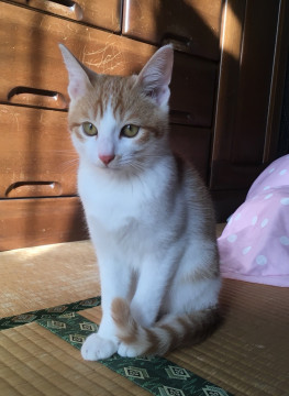 目の色は黄色で、薄い茶色と白のトラ柄です。