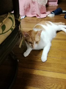 お腹の部分が白くて背中にぶち模様でしっぽの先が曲がってます。