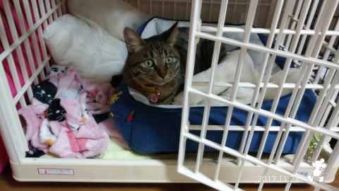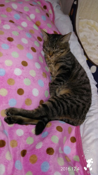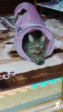 しっぽの先が少しおれている。カギしっぽ。顔は小さいがお腹はポッコリしている。脱走した日、首輪のみ発見する。そのため、首輪は着いていない状態。