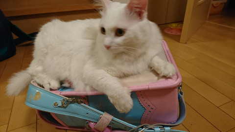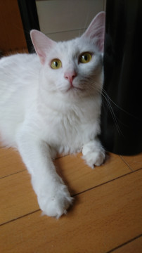 白い長毛の猫です。とでもビビりな猫です。ほとんど家から出た事がありません。紫色の首輪をしています。