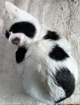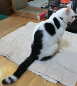 白地に黒ブチ模様。長めの黒しっぽの先に二重の白線。