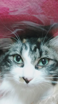 種類は三毛猫 雑種だけど毛はフサフサでお腹は真っ白 鼻の下に黒い毛が生えてて、しっぽは折れ曲がっています